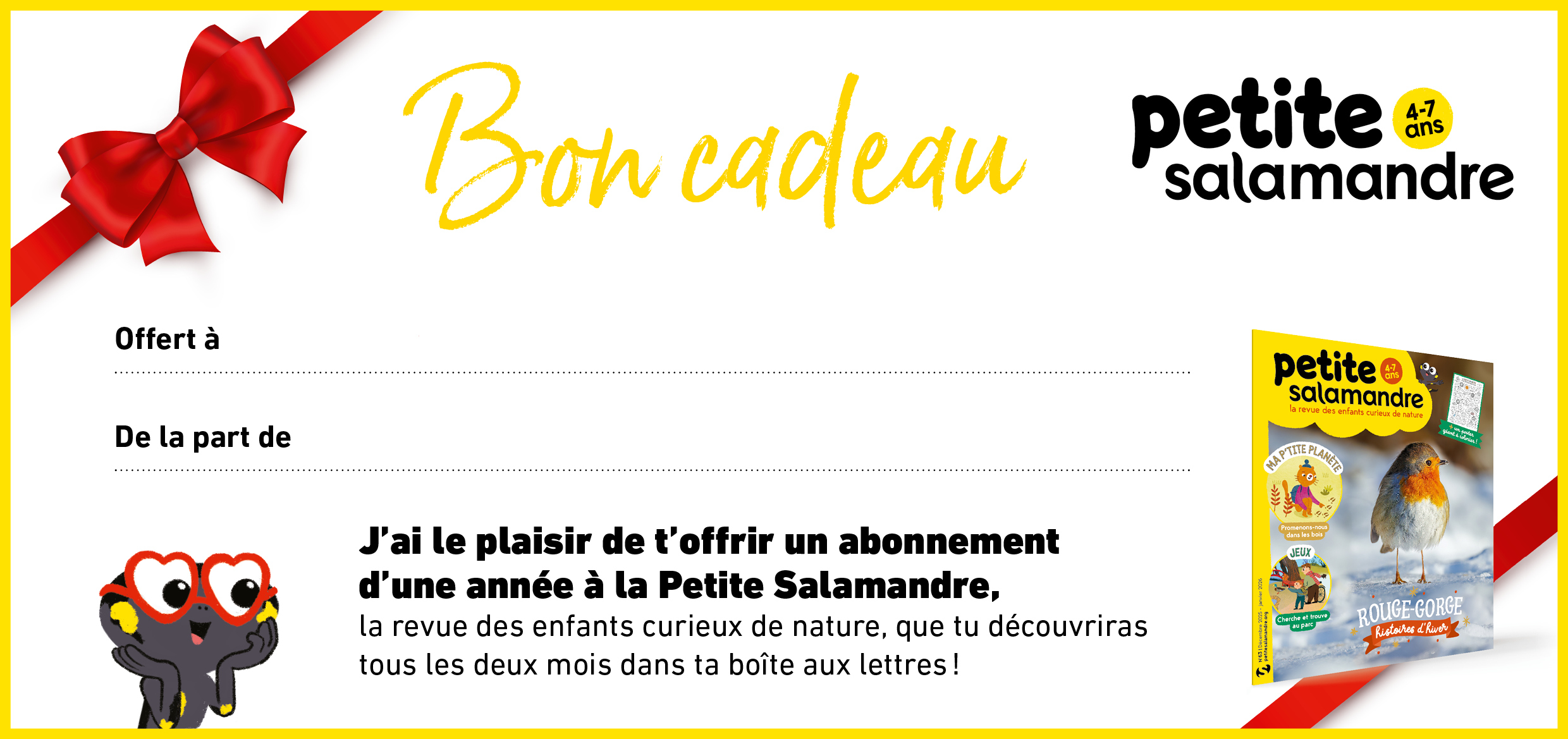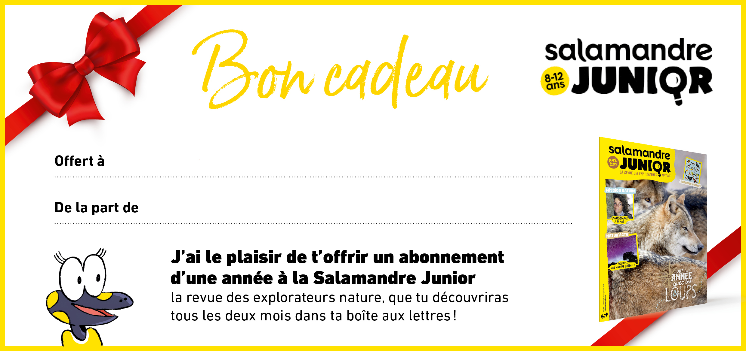 Oups la Salamandre-Noël est déjà en route ! Mais pas de soucis, nous vous avons préparé un BON Salamandre pour que vous ayez quand même quelque chose à mettre sous le sapin.