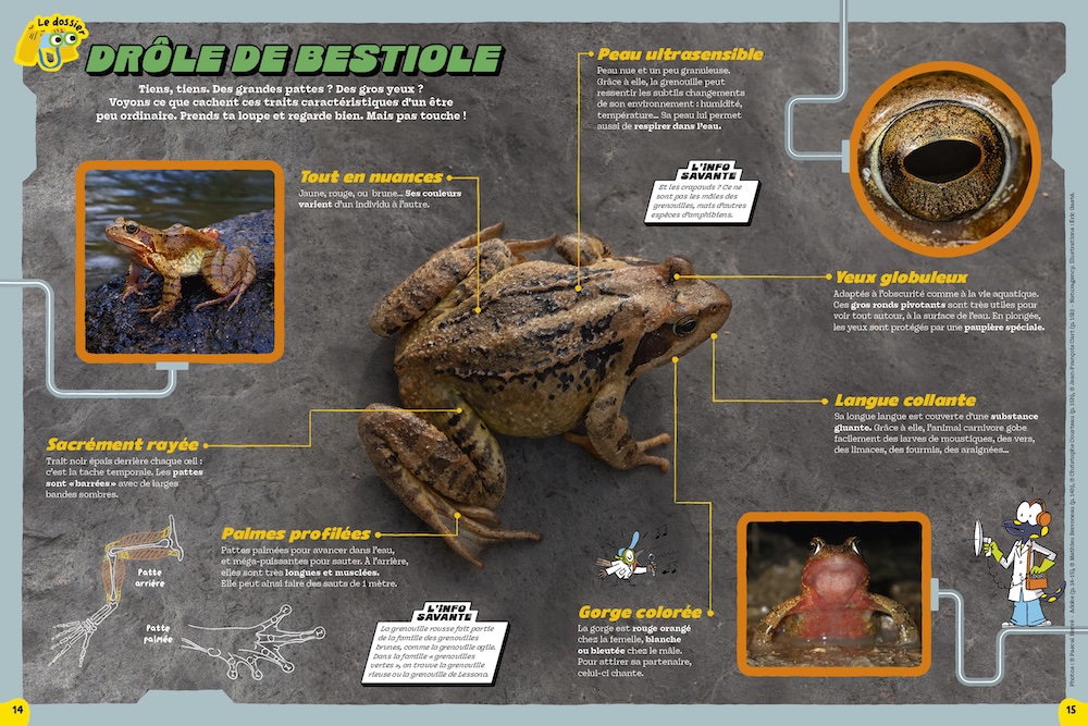 Ça grouille, ça bouillonne, ça sautille, et ça fait de drôles de cris. Qui va là ? C’est la grenouille rousse. Quand approche la fin de l’hiver, cet amphibien étrange et gluant passe de la terre ferme à l’étang. On le croirait sorti du labo d’un savant un peu fou ! Découvrez avec vos enfants et petits-enfants cette créature brillante.