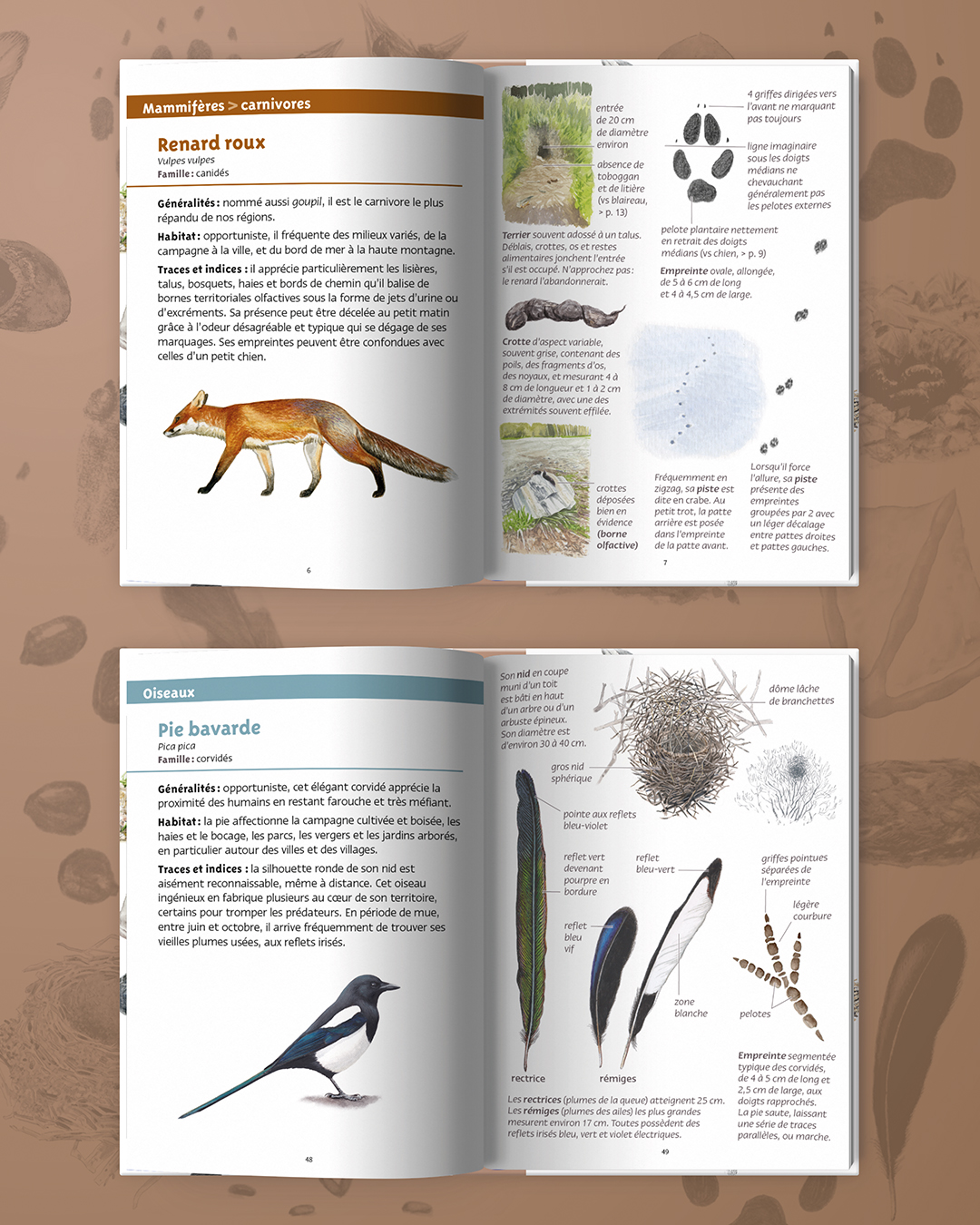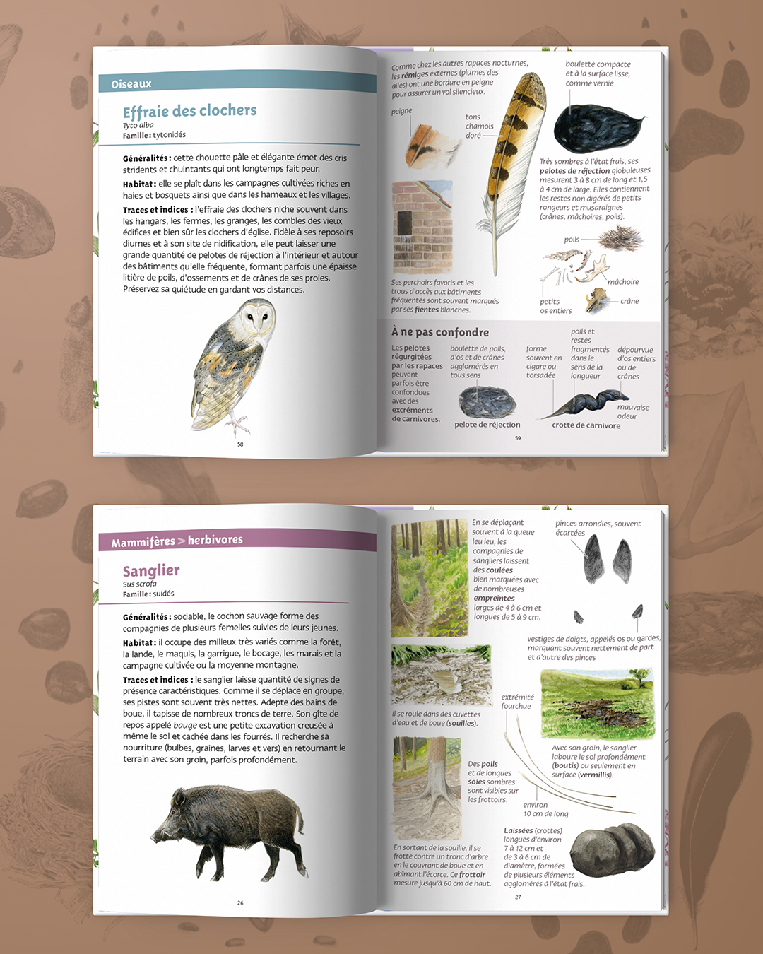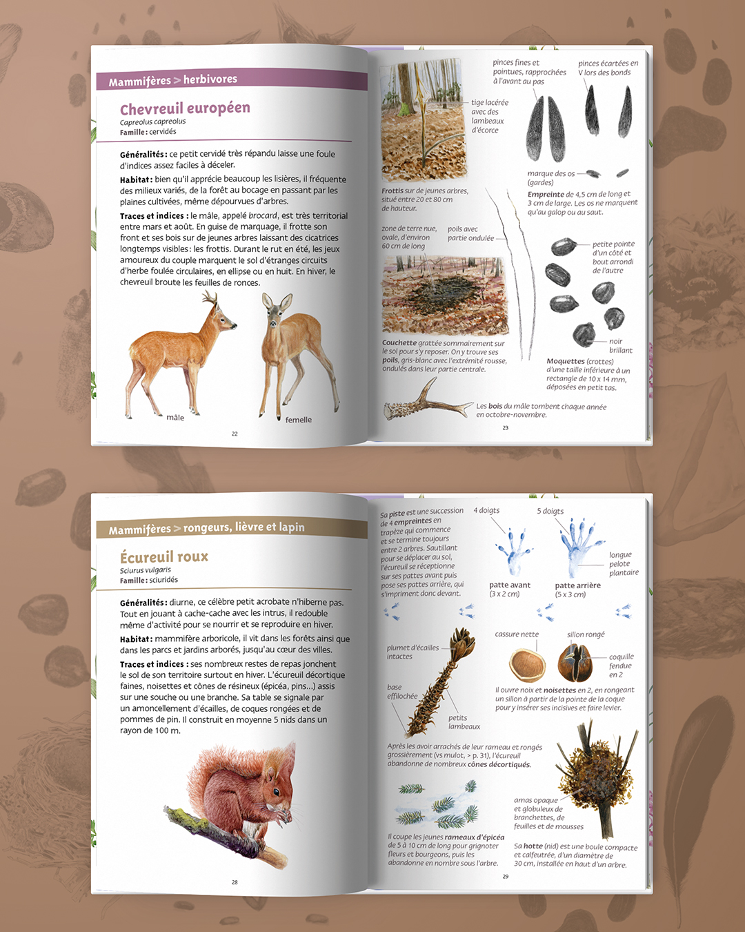 > Description complèteUne empreinte sur le sentier, une cavité dans un tronc ou une pomme de pin grignotée : les mammifères et les oiseaux laissent derrière eux un grand nombre d’indices mystérieux. Riche et magnifiquement illustré, ce petit guide présente traces, crottes, pistes, terriers et restes de repas des animaux de nos régions. Au jardin ou en forêt, en ville comme à la campagne, apprenez à décrypter leurs signatures.