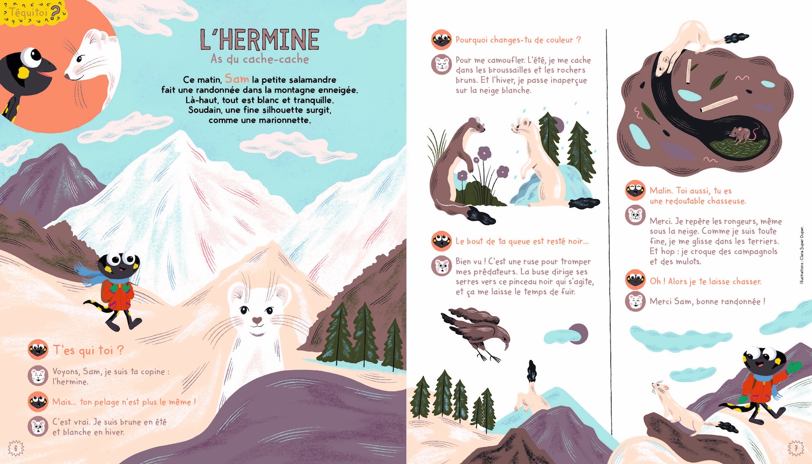 Téquitoi ? : Ce matin, Sam la petite salamandre fait une randonnée dans la montagne enneigée. Là-haut, tout est blanc et tranquille. Soudain, une fine silhouette surgit, comme une marionnette.