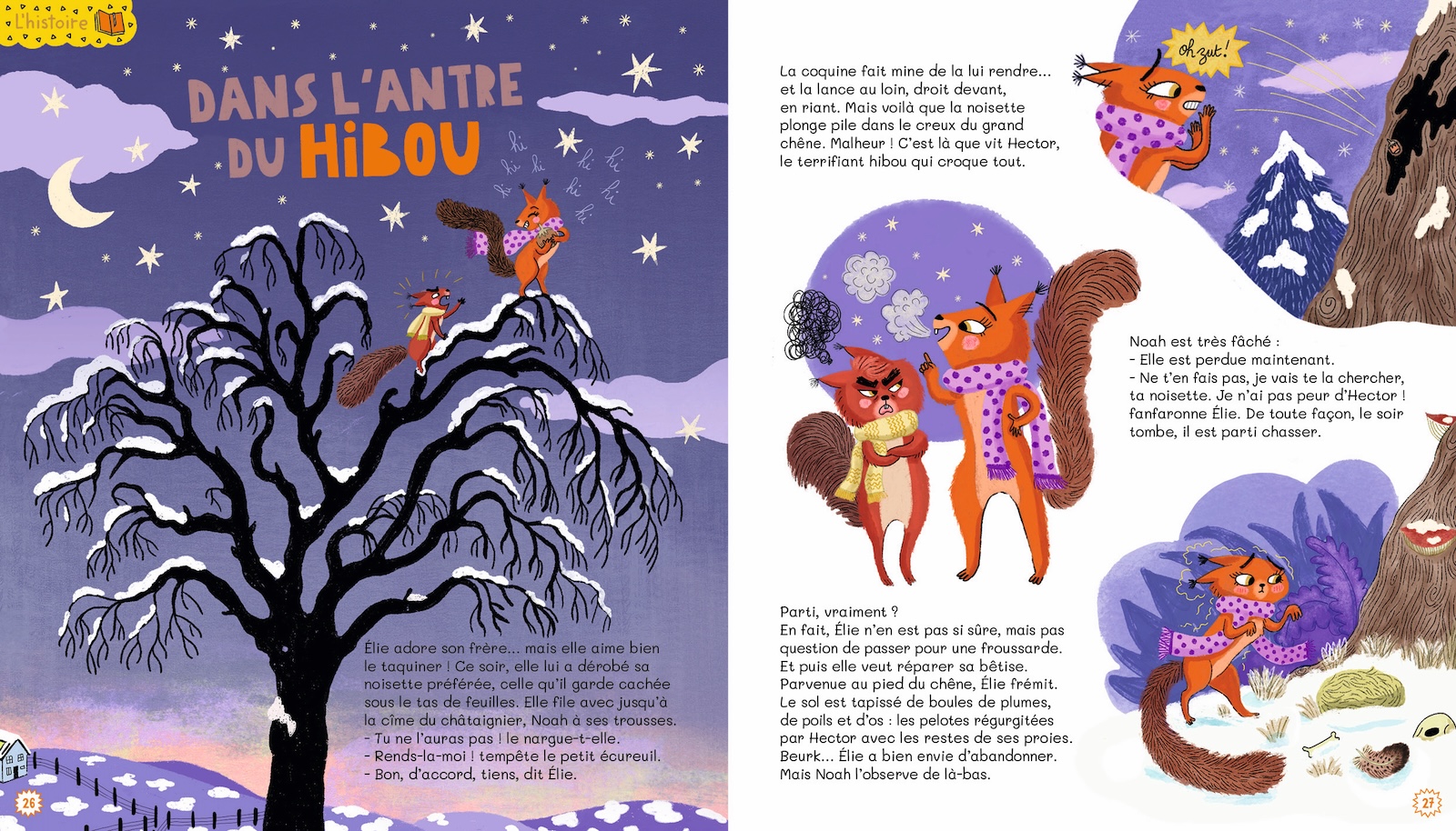 Élie adore son petit frère, Noah… et elle aime aussi le taquiner ! Ce soir, elle lui a volé sa noisette et la lance au loin, en riant. Mais voilà que la noisette plonge dans le trou du chêne. Malheur ! C’est là que vit Hector, le terrifiant hibou qui croque tout. Noah est si triste qu’Élie n’a pas le choix : elle doit récupérer la noisette...